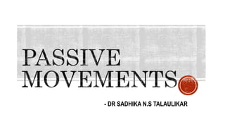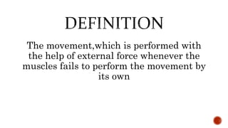 This document discusses passive movements in physical therapy. It defines passive movements as smooth, rhythmic movements performed by a therapist or device on a patient, within their pain-free range of motion, to help increase range of motion when muscles cannot move a joint on their own. It describes different types of passive movements including manual techniques by therapists and mechanical techniques using devices, and provides guidelines for properly performing passive movements.