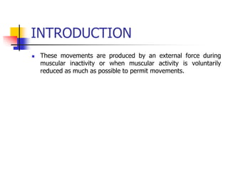 Passive movement involves moving a body part without active muscle contraction. There are several types: relaxed passive movements where a therapist smoothly moves a joint within its pain-free range; accessory movements which are small rotational or gliding motions in a joint; and passive manual techniques like joint mobilizations and manipulations. Controlled stretching can also be applied to tight muscles and tissues. Passive movements help maintain range of motion, prevent adhesions, reduce swelling, and stretch contracted structures. They are important for patients who cannot actively move due to injury or condition.