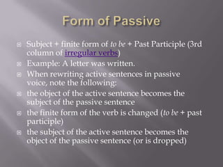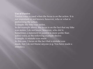 The document discusses the use of passive voice in sentences. Passive voice is used when the focus is on the action rather than the subject performing the action. It provides examples of active and passive voice sentences. The passive voice can make a statement more polite by leaving out the subject responsible for the action. The document also outlines how to change active voice sentences to passive voice by making the object of the active sentence the subject of the passive sentence and using forms of "to be" plus the past participle of the main verb.