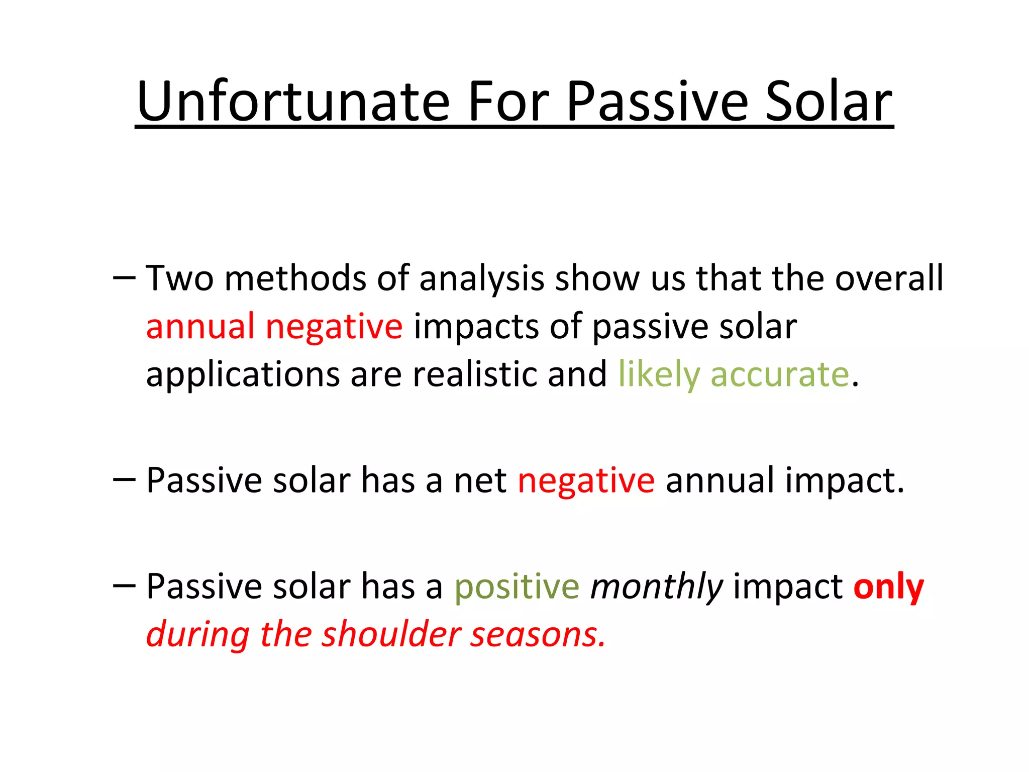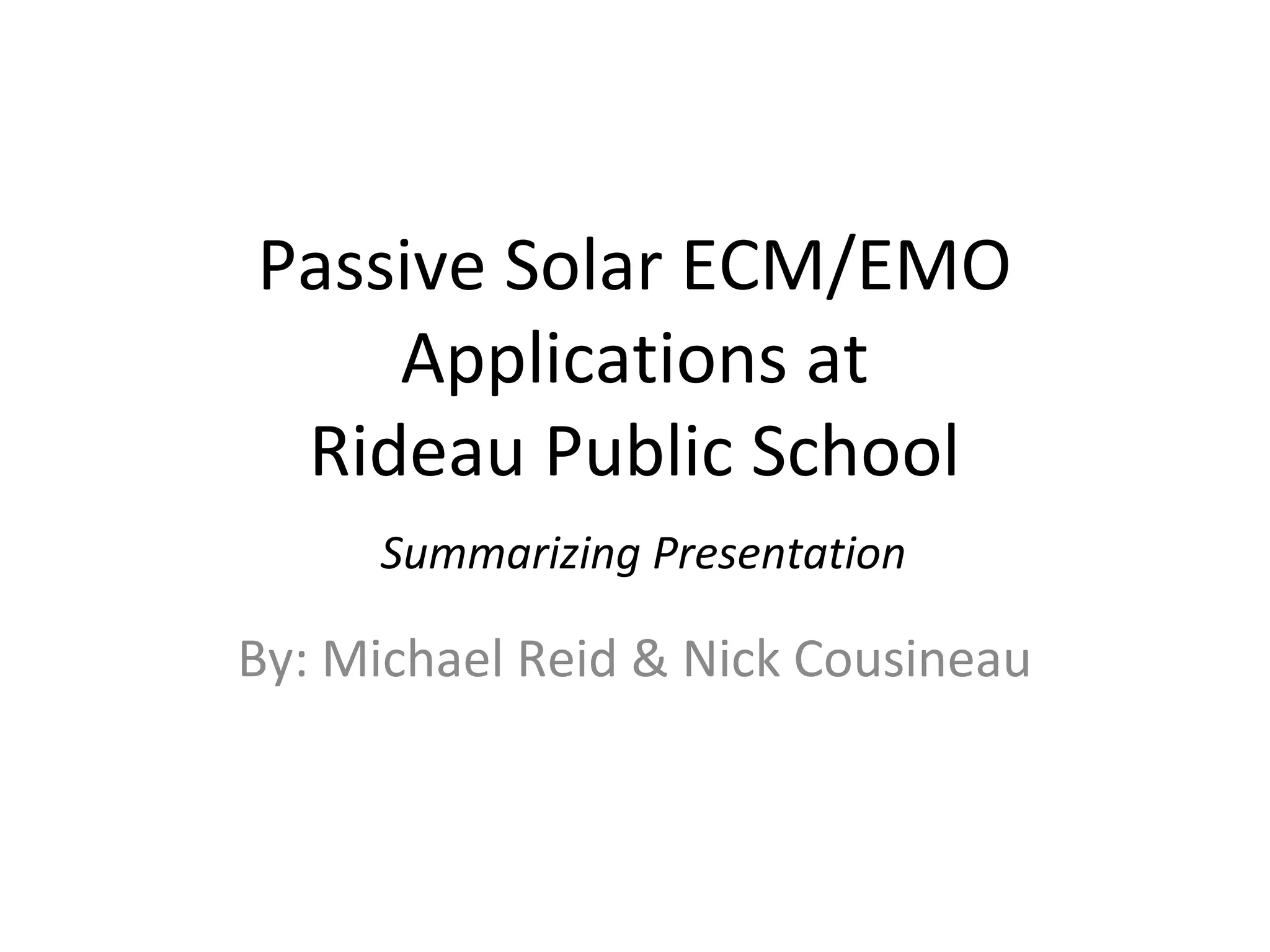 This document summarizes a presentation about passive solar applications at Rideau Public School. It finds that passive solar has a net negative annual impact on heating and cooling costs, but a positive impact during shoulder seasons. It explains the science behind low-emissive window coatings and models the equivalent heat loss from different window upgrades. It concludes that passive solar is best suited for shoulder seasons and the only way to achieve net annual savings is an expensive window upgrade to a U-value of 0.7 for the school's largest south-facing windows.