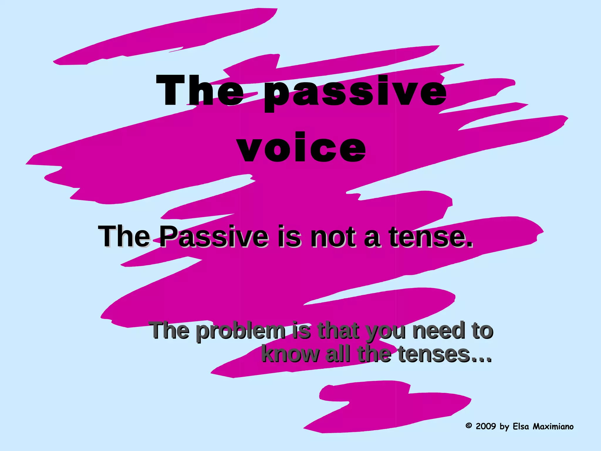 The document discusses the passive voice and how to form passive sentences in different tenses, including the present simple, present continuous, past simple, present perfect, past perfect, and future. Examples are provided to illustrate how to transform active sentences into their passive equivalents in each tense by using the appropriate form of "to be" along with the past participle of the main verb. Certain verbs like "die", "happen", and "stay" are noted as being unable to be used in the passive voice.