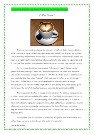 The passage discusses the history and spread of coffee. It describes how coffee was first discovered by a goat herder in Ethiopia and then used by various tribes. It explains that Arabs began boiling the coffee beans to create a drink and the Turks were the first to adopt coffee as an everyday beverage. The passage also notes that coffee was introduced to Europe by Italian traders in the 1600s and then spread widely, with coffeehouses opening across countries and becoming popular meeting places.