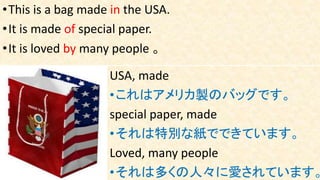 The document discusses various items and their attributes, focusing on the passive voice in English. It provides examples of bags, pictures, parks, speeches, movies, and books, along with their creators or locations. The document highlights the use of passive structures to describe these subjects, emphasizing their origins and creators.