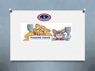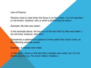Passive voice is used when the focus is on the action rather than the actor. It is used when the actor is unknown or unimportant. With passive voice, the subject receives the action rather than performs it. Some examples of passive voice are "My bike was stolen" and "A mistake was made" which focus on the actions but do not specify who performed them, making the statements more indirect and sometimes more polite. The form of a passive sentence is subject + to be verb (is, are, was, were) + past participle.