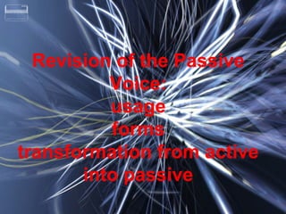 This document discusses the passive voice, including its forms, usage, and transformation from active to passive sentences. Various examples of active and passive sentences are provided to illustrate the passive voice, along with explanations of its formation in simple present, past, perfect, and progressive tenses. Exercises are included to practice transforming sentences between active and passive voice.