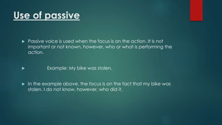The document discusses the passive voice in English. It begins by explaining that the passive voice focuses on the action rather than the subject performing the action. It provides examples of active and passive sentences. It then notes that the passive voice can sometimes sound more polite by omitting reference to who performed an action. The document goes on to explain the formation of the passive voice using the subject, form of "to be", and past participle. It also discusses how the subject and object of an active sentence change in the passive form. Finally, it distinguishes between personal and impersonal passive, noting impersonal passive is rarer and only used with verbs of perception.