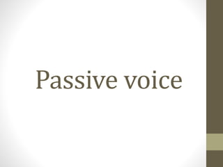 The document discusses passive voice, including its uses, formation, examples of verb tenses in passive voice, and how to transform sentences from active to passive voice. Passive voice is formed using the auxiliary verb "to be" and the past participle of the main verb. It is used when the actor is unknown or less important than the action. To change an active sentence to passive, the object becomes the subject, the verb is changed to a form of "to be" plus the past participle, and the original subject is added as a prepositional phrase introduced with "by".
