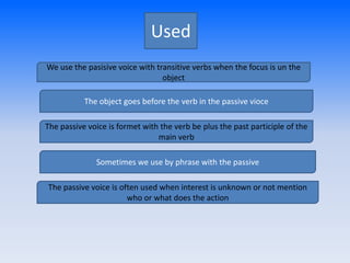 The passive voice is a grammatical construction where the subject receives the action of the verb rather than performing it. It is formed using a form of the verb "to be" along with the past participle of the main verb. The object of an active sentence becomes the subject of the passive sentence. The passive voice is used when the performer of the action is unknown, unimportant, or obvious from context, and allows emphasis to be placed on the recipient of the action rather than on the performer.