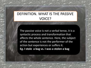 The passive voice is a syntactic transformation that shifts the focus from the subject performing an action to the subject experiencing the action. In this construction, the object of the active voice can become the subject, and it often emphasizes different elements in a sentence. The document explains how to form passive constructions in English and highlights their usage in various contexts.
