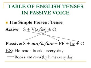 The document discusses the formation of passive voice across different English tenses. It provides examples of active and passive voice constructions for simple present, present continuous, present perfect, simple past, past continuous, past perfect, simple future, future continuous, and future perfect tenses. It also discusses the use of passive voice with modal verbs, causative forms, infinitives, gerunds, and other verb combinations.