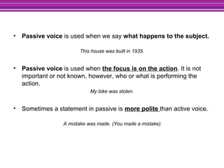The document discusses the passive voice and causative structures in English. It explains that the passive voice is used when the focus is on the action rather than the subject performing the action. It provides rules for transforming sentences from active to passive voice, including making the object the subject and using forms of the verb "to be" plus the past participle. Examples are given for different tenses. The causative structure is used to indicate having something done by another person, using "have" and "get" plus the past participle.