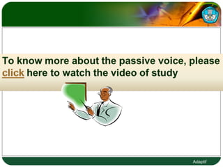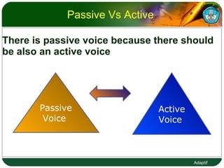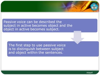 The document discusses the differences between active and passive voice in English grammar. It defines subjects and objects in active sentences and provides examples of simple present, present continuous, simple past, and simple future tenses in both active and passive forms. Key differences are highlighted such as the subject receiving the action in passive sentences instead of doing the action in active sentences.