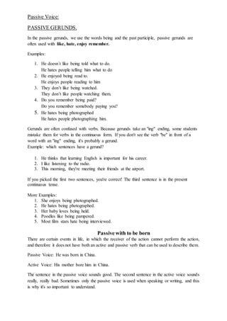 The document discusses various uses of the passive voice in English, including with two objects, gerunds, the verb "to be born", and using "get" instead of "be". It provides examples for each case. Key uses covered include sentences with a direct and indirect object where either can become the subject in passive form. Gerunds ending in "-ing" but functioning as nouns rather than verbs are also discussed. Certain events like birth are usually expressed in the passive. Finally, "get" can replace "be" in informal passive constructions.