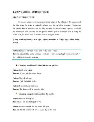 This document discusses the future passive tense in English grammar. It explains that in passive sentences, the thing receiving the action is the subject and the thing doing the action can be optionally included. The future passive is formed using "will/shall + be + past participle" and optionally "by + the thing doing the action". Examples are provided of changing active sentences into the passive in the future tense, including affirmative, negative, and interrogative sentences. Bibliography sources on the future passive are also listed.