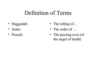 The document outlines the key elements of a Passover Seder adapted from a Christian perspective. It discusses how the Passover observances began 3,500 years ago and reveal the Jewish roots of the New Covenant faith. The Seder is a physical sign that points to deeper spiritual truths, as Christ's work fulfills the meaning of the Passover. Elements of the Seder like cleansing homes of leaven, blessing candles, and drinking four cups of wine all symbolize spiritual promises and truths from God.