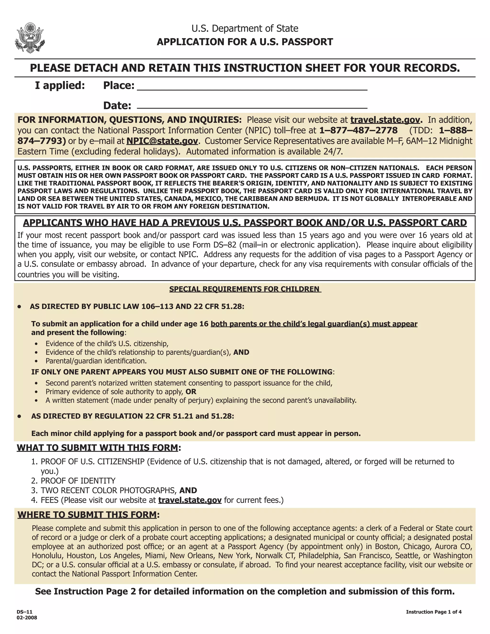 1) This document provides instructions for applying for a U.S. passport through the Department of State. It outlines requirements for proof of citizenship, identity, photographs, fees, and how/where to submit the application.