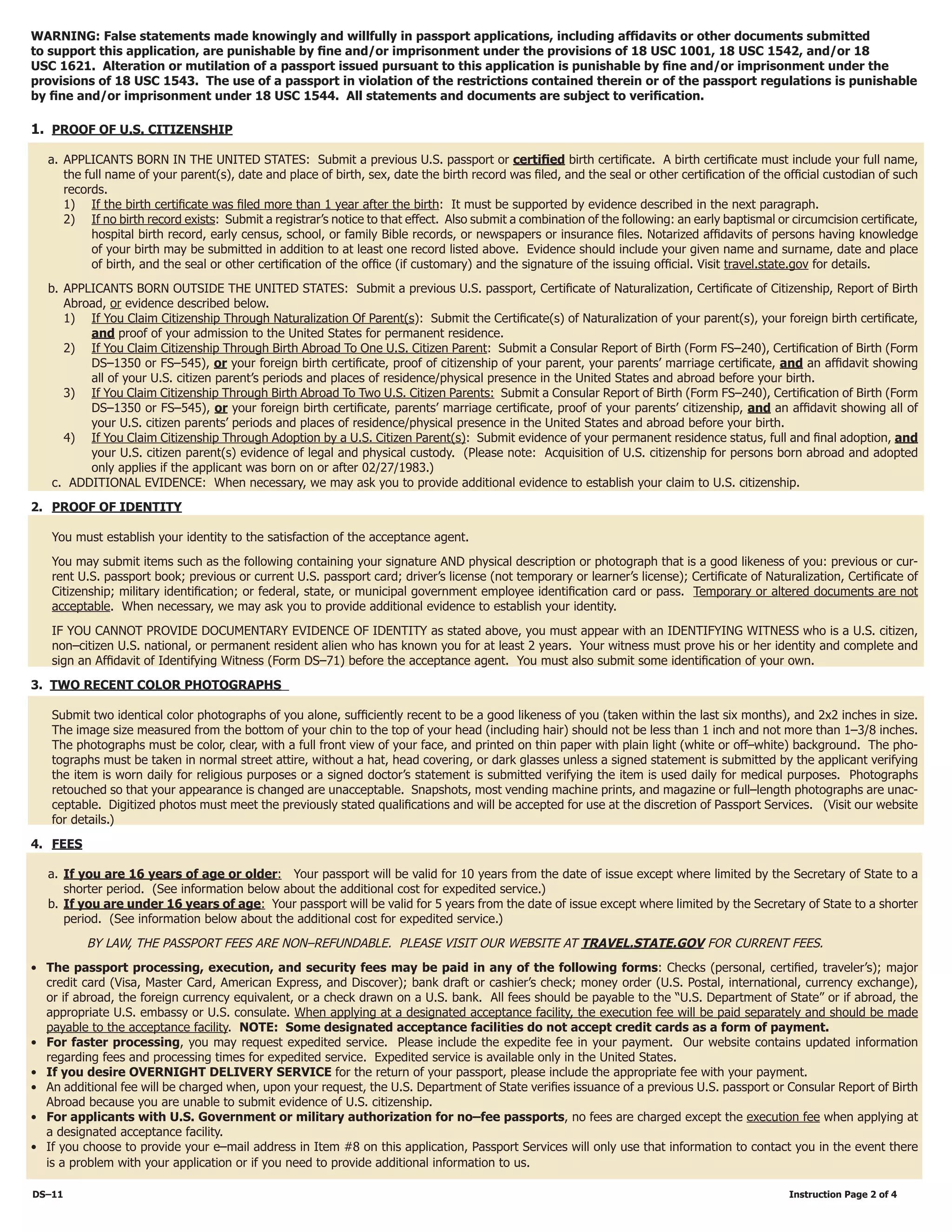 3) The instructions warn that making false statements on the application is punishable by law and that passport fees are non-refundable.
