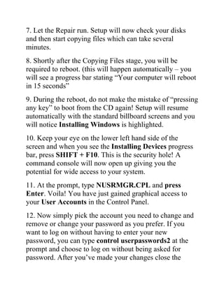 This document provides instructions for repairing a Windows XP installation and changing the user password without knowing the current password. It involves booting from the Windows XP install CD, starting the repair process, pressing Shift + F10 during the install to open a command prompt, and using commands like NUSRMGR.CPL to access and modify user accounts and passwords. Once changes are made, the repair process must be completed for the new passwords to take effect. Creating a password reset disk is also recommended to avoid getting locked out in the future if the password is forgotten again.