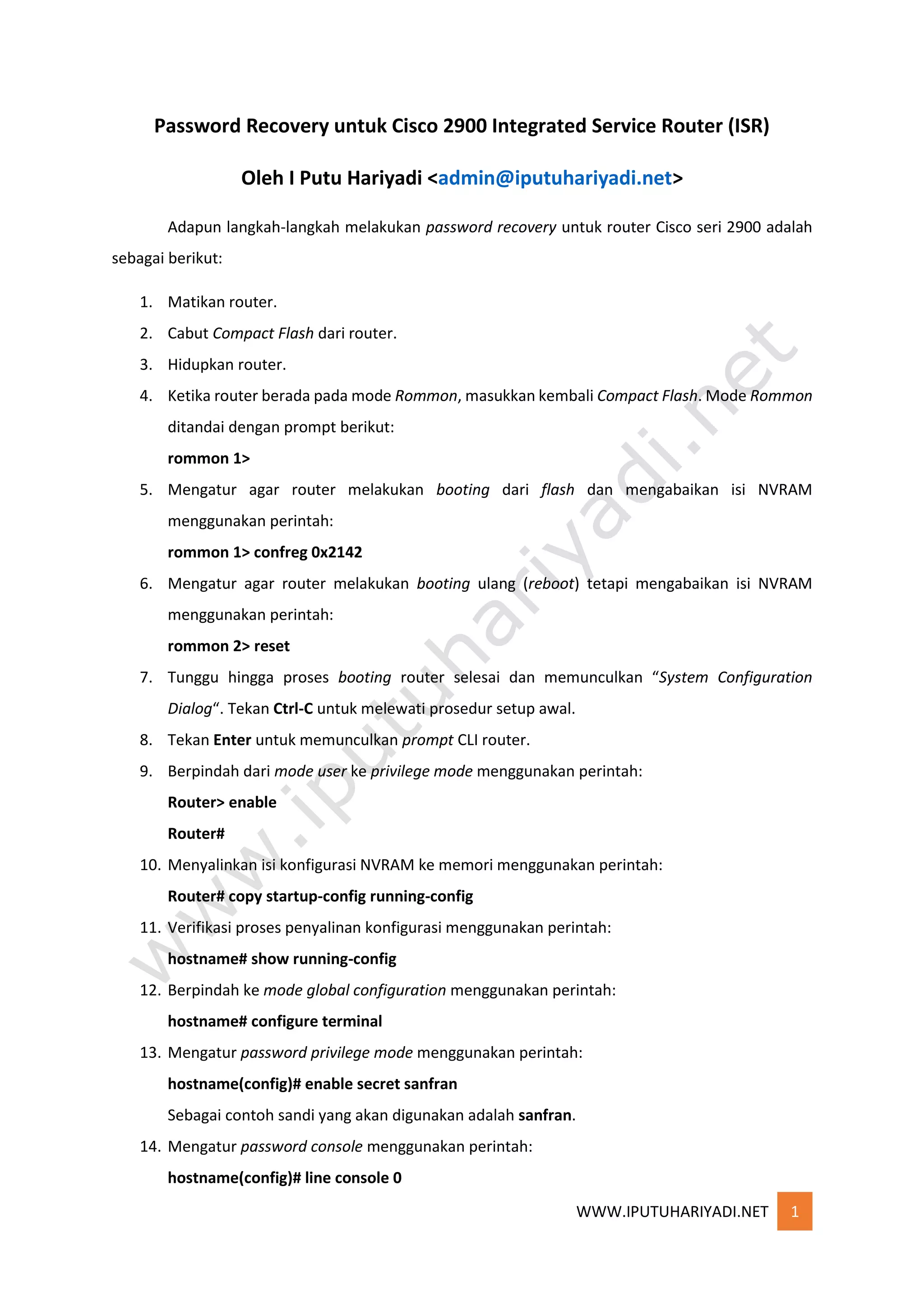 Dokumen ini menjelaskan langkah-langkah untuk melakukan pemulihan password pada router Cisco seri 2900, dimulai dari mematikan router hingga menyimpan konfigurasi baru secara permanen. Proses tersebut mencakup pengaturan mode rommon, penyalinan konfigurasi, pengaturan password untuk mode privilege, console, dan telnet, serta mengaktifkan interface. Artikel ini bertujuan untuk membantu pengguna yang membutuhkan solusi untuk password recovery pada router tersebut.