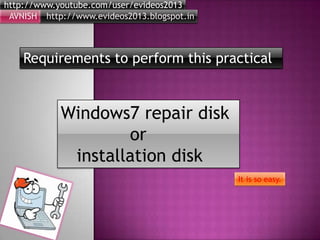The document provides steps to reset a Windows 7 user's password using a repair or installation disk. It instructs the user to boot from the disk, select "Repair your computer" from the menu, open the command prompt, and use the "net user username newpassword" command to reset the password. The process is described as easy to perform and only requiring a Windows 7 repair or installation disk.