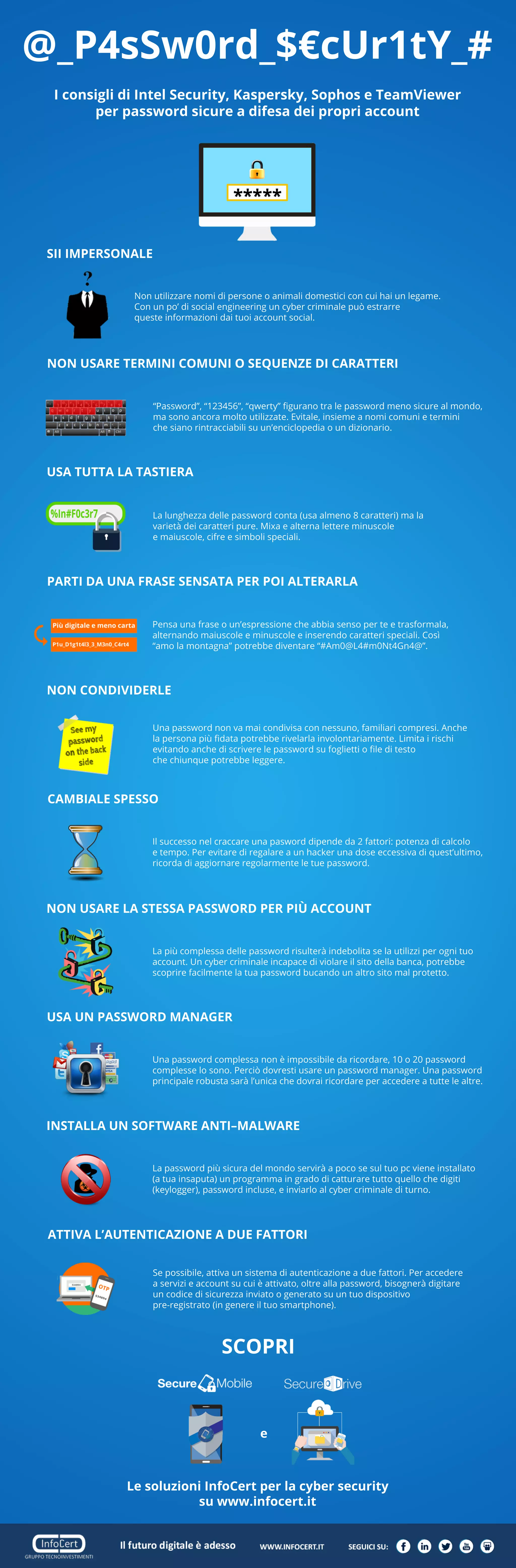 Il documento fornisce indicazioni su come migliorare la sicurezza delle password attraverso l'autenticazione a due fattori, l'uso di un password manager e pratiche di gestione delle password sicure. Suggerisce di evitare password comuni e di non riutilizzare le stesse password per più account, enfatizzando l'importanza di aggiornare regolarmente le credenziali. Infine, avverte contro la condivisione delle password e il rischio di keylogger.