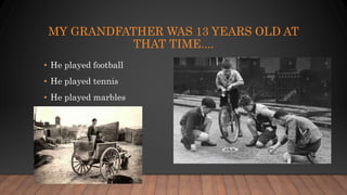The document recounts memories of the author's grandfather in 1947, highlighting his childhood activities such as playing sports, going to the disco, and socializing with friends. It also describes his diet, clothing, and the technology of the time, noting he had a little TV and listened to musicians like Bing Crosby and Frank Sinatra. Additionally, it contrasts this with the author's father's experiences in 1983, including the absence of mobile phones.