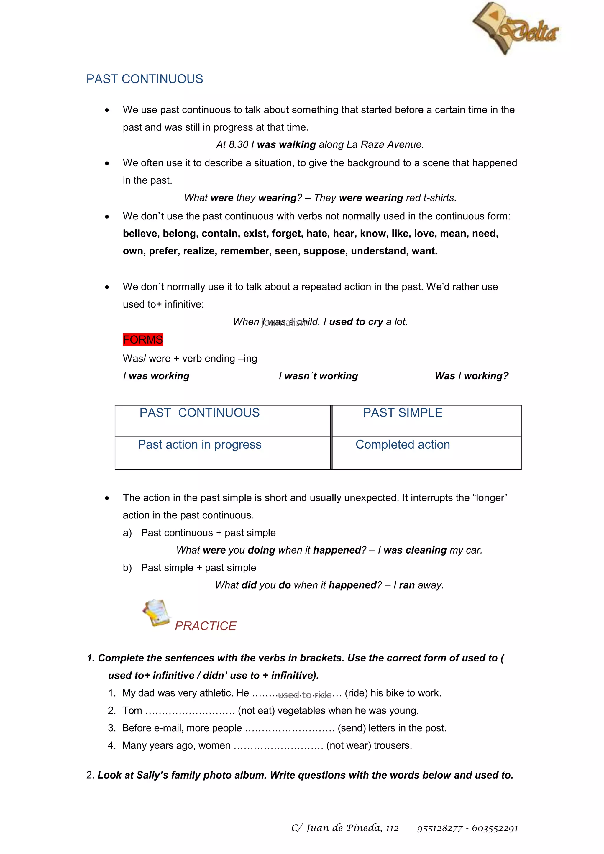 We use the past continuous tense to talk about actions that were ongoing or in progress at a specific time in the past. The document provides examples of using the past continuous to describe background situations and ongoing actions. It also explains that the past continuous is not used with stative verbs and is not the preferred tense for repeated past actions. Finally, the document contrasts the past continuous with the past simple tense, noting that the past simple is used for completed actions that may interrupt ongoing past continuous actions.