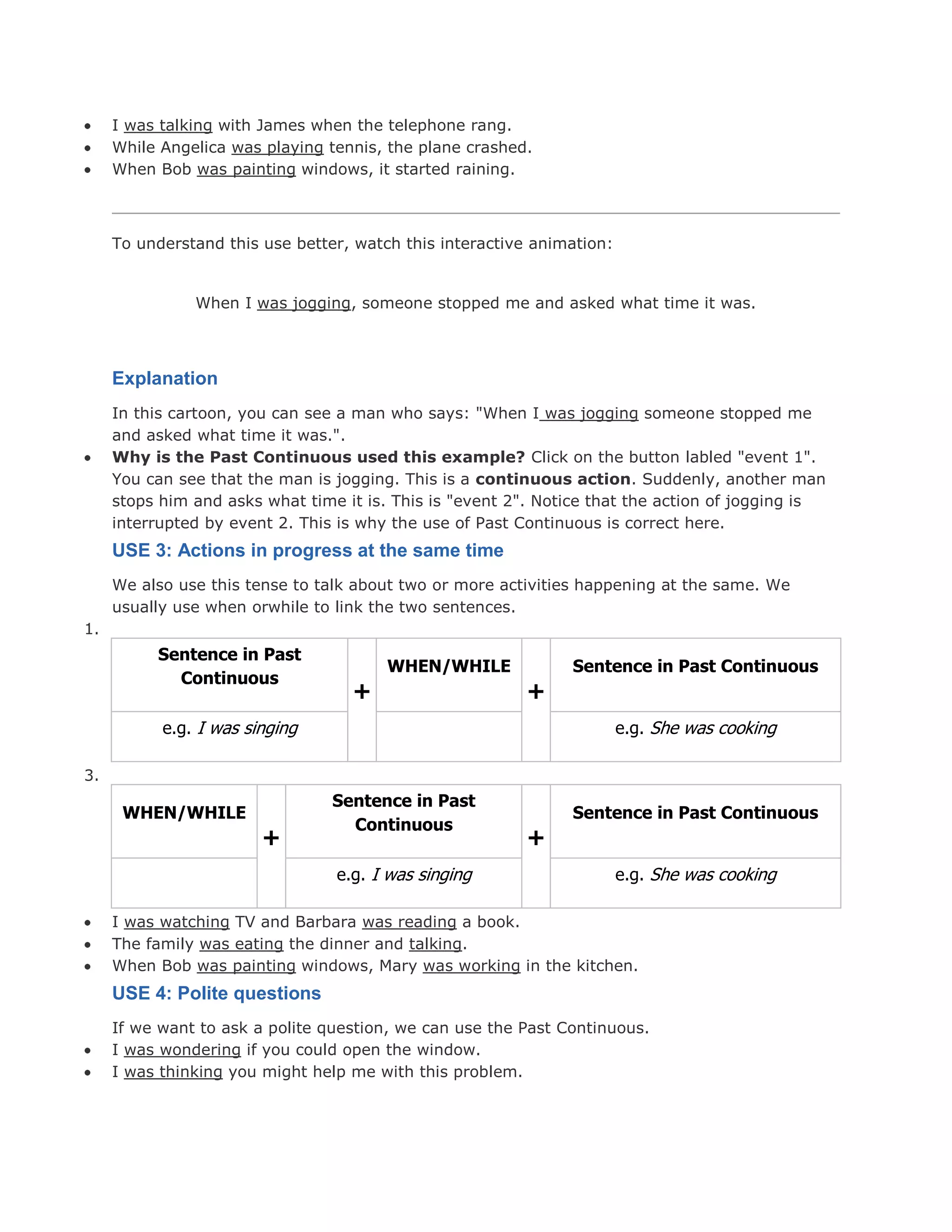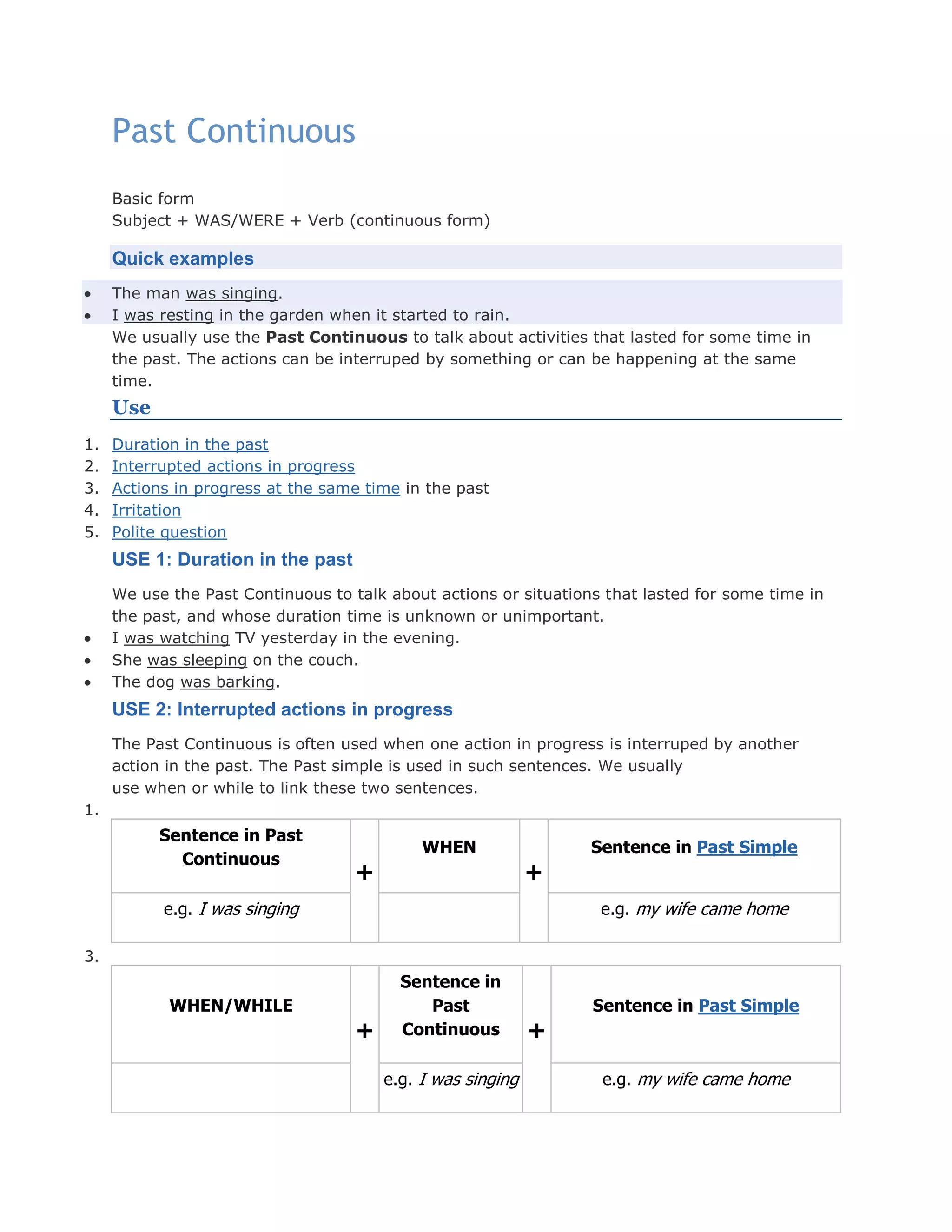 This document discusses the past continuous tense in English. It provides the basic structure of subject + was/were + verb+ing and examples like "The man was singing". The past continuous is used to describe actions that were ongoing or in progress in the past. It can be used to talk about (1) duration of past actions of unknown length, (2) interrupted past actions, and (3) simultaneous past actions. Additional uses include polite questions and expressing irritation over past events.