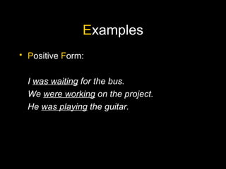 The document explains the past continuous tense in English, providing examples of positive, negative, and question forms. It highlights its use to describe actions that were ongoing in the past, with a structure involving a past tense form of 'be' combined with the 'ing' form of a verb. Additional examples illustrate this grammatical concept in context.
