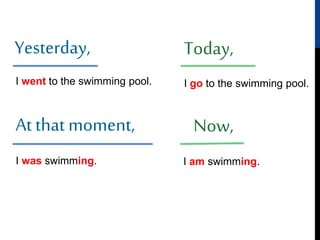 The document describes someone's activities at the swimming pool, stating that they went to the swimming pool yesterday and now they are swimming at the pool.