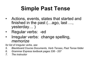 The document discusses the past continuous verb tense in English. It describes three main uses of the past continuous tense: 1) to describe actions that were in progress at a particular time in the past, 2) to describe two or more simultaneous actions in the past, and 3) to set the scene or describe an interrupted past action. Examples are provided to illustrate forming the past continuous tense and using it with other past tenses like the simple past.