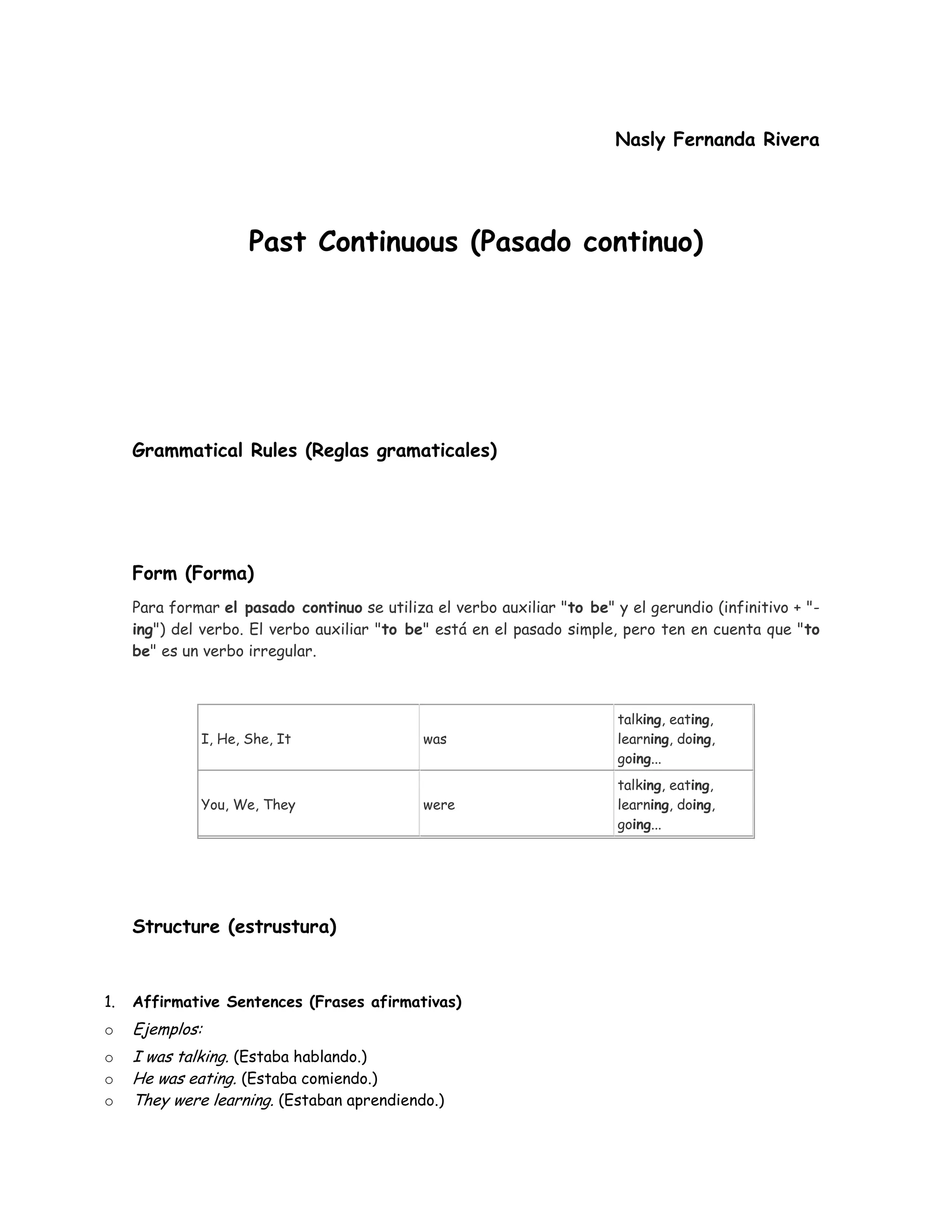 The document provides rules and examples for using the past continuous tense in English. It explains that the past continuous is formed using the past tense of "to be" plus the present participle ("-ing" form) of the main verb. It gives examples of affirmative, negative, and interrogative sentences in the past continuous. It also describes common uses of the past continuous, such as for interrupted or ongoing past actions, actions happening at a specific time in the past, and two simultaneous actions in the past. An exercise at the end provides additional examples of forming sentences in the past continuous tense.