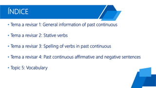 This document provides an overview of the past continuous tense in English. It discusses four main topics: (1) the formation of the past continuous with the verb "to be" and verb + "ing"; (2) the use of stative verbs in the past continuous; (3) spelling rules for verbs in the past continuous; and (4) affirmative and negative sentences in the past continuous. Examples are provided throughout to illustrate the concepts and vocabulary words are included with pictures at the end.