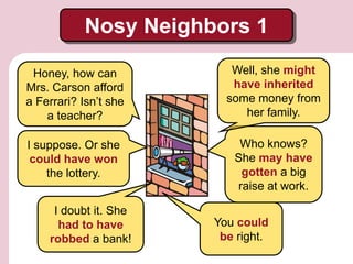 This document discusses the use of modal verbs to express different degrees of certainty in English. It explains that: