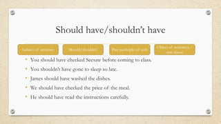 This document discusses past modal verbs used to talk about actions or events that did not actually happen in the past. It provides examples of "should have", "shouldn't have", "could have", and "would have" followed by their meanings. "Should have" and "shouldn't have" express regret about actions that did or did not occur. "Could have" and "would have" refer to possibilities that were not realized. The document concludes with prompts for roleplaying scenarios using these past modal verbs.