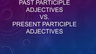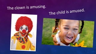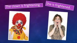 This document discusses the difference between past participle adjectives ending in "-ed" and present participle adjectives ending in "-ing". It provides examples of sentences using each type of adjective to describe feelings caused or received. The document encourages practicing writing 2 sentence descriptions for different pictures to better understand using "-ed" and "-ing" adjectives.