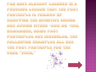 The document discusses the past perfect tense in Spanish and English. The past perfect expresses the idea that something occurred before another past action or time. In Spanish, the past perfect is formed using the helping verb "haber" and the past participle. It summarizes common uses like expressing actions that started in the past and continued up until another past time. Examples are provided to illustrate using the past perfect to refer to completed actions that happened before other events in the past.