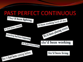 The document discusses the past perfect continuous tense. It explains that the past perfect continuous is used to show that a situation continued in the past until another past situation. It provides the example "I'd been doing language works all weekend long so I decided to have a break at Patty's house." The document also notes that the past perfect continuous is used in reported speech, and provides examples of sentences using this tense. It concludes by stating this tense is often used with certain words or phrases.