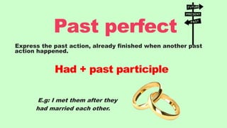 The document discusses the differences between the past perfect and past perfect continuous tenses in English. The past perfect tense uses "had + past participle" and is used to describe events that occurred before other past events or to emphasize completed actions. The past perfect continuous tense uses "had been + verb + ing" and emphasizes the duration of past activities, describes ongoing past actions that continued into other past times, or shows the cause of past events. Examples are provided for how to use each tense.