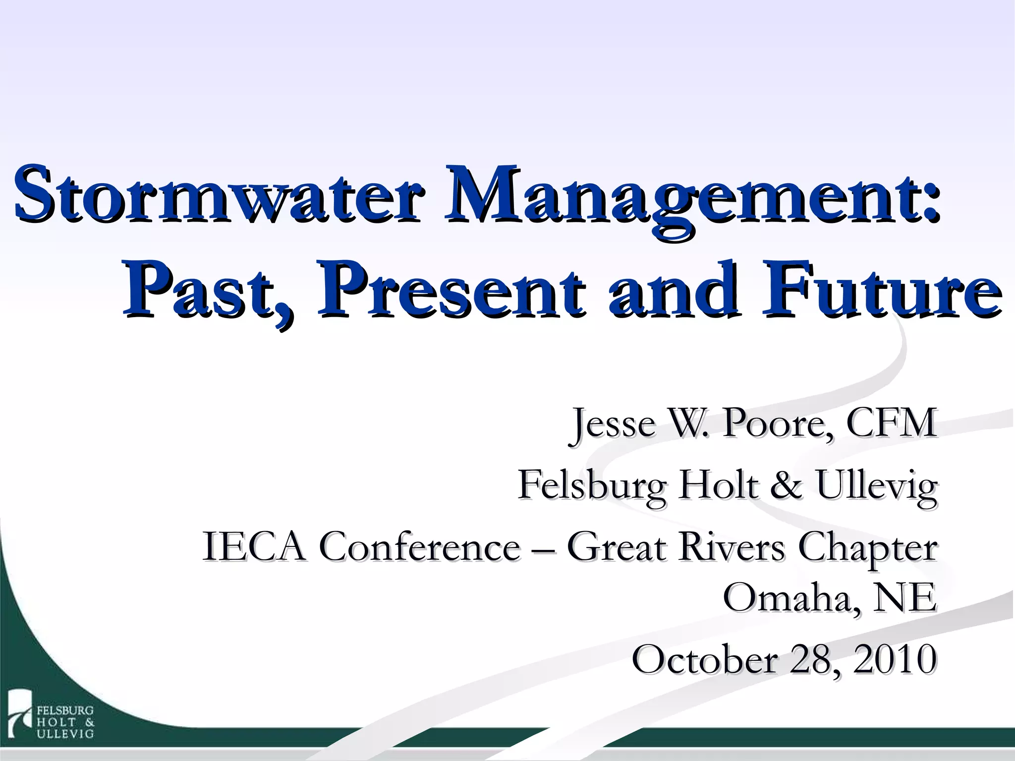 The presentation discusses the evolution of stormwater management laws from 1948 to 2010, highlighting significant legislation such as the Clean Water Act and its amendments, which aimed at controlling pollution and improving water quality through various frameworks of regulations and management practices. It details the development of National Pollutant Discharge Elimination System (NPDES) permits and the importance of best management practices (BMPs) in urban and industrial stormwater management. The future of these regulations emphasizes a results-driven approach, focusing on measurable outcomes and the need for adaptive strategies in response to urban pollution challenges.