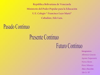 The document provides information about a group project for a class. It lists the names of 4 students - Albornoz Génesis, Aponte Emperatriz, Navea Alexis, Pérez Nilaurys - who are working on the project together. It also states that they are in the 2nd year, section B.
