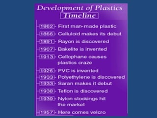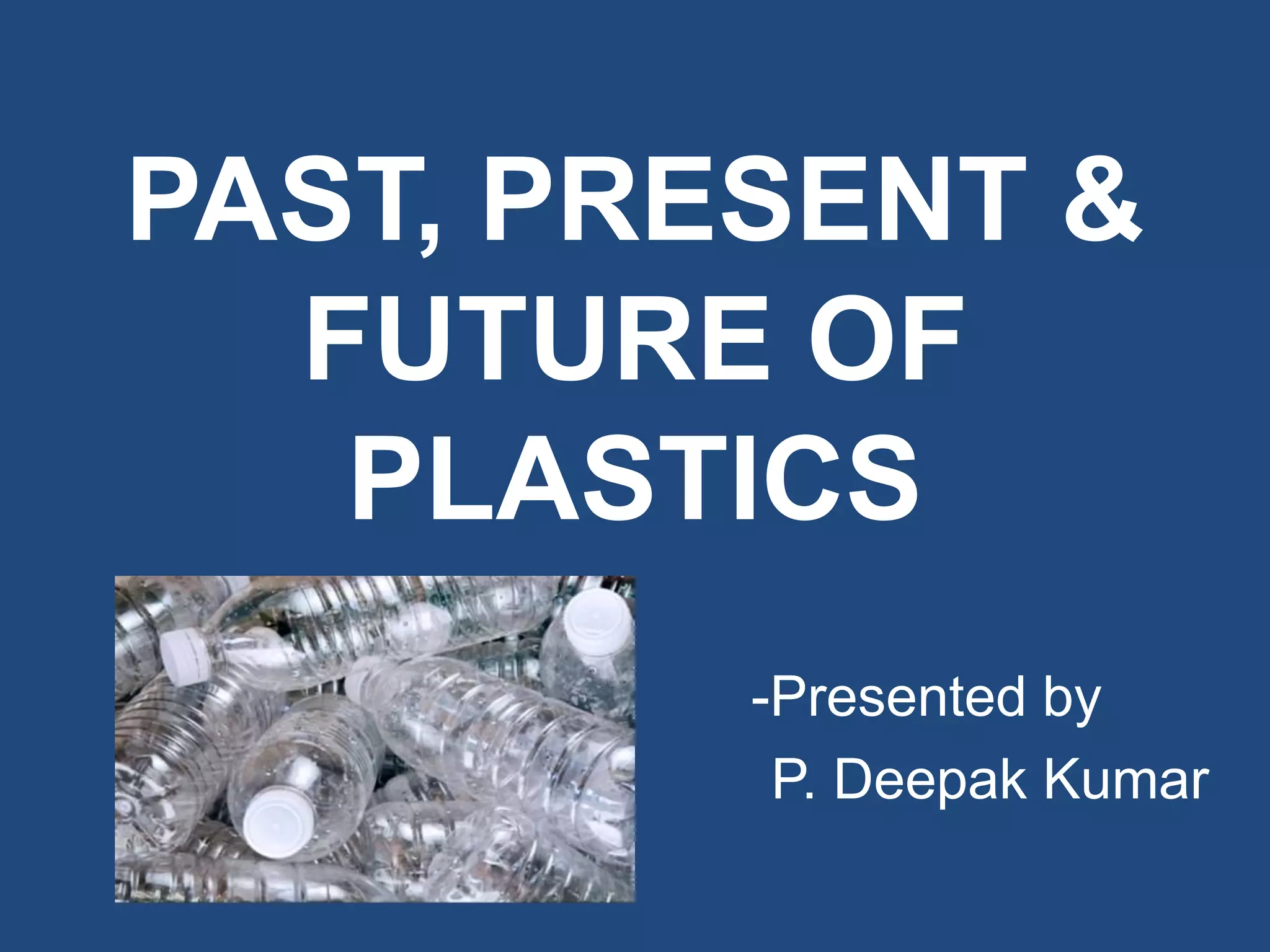 This document discusses the past, present, and future of plastics. It outlines the history of plastics from the first plastic invented in 1862 to modern polymers and applications. Currently, plastics are widely used in products like cars, medical devices, electronics, and more. The future of plastics may include 3D printing of body parts, bacteria-resistant varieties, and use in OLED displays. Plastics have become an important part of modern life due to their versatility, durability and low cost.