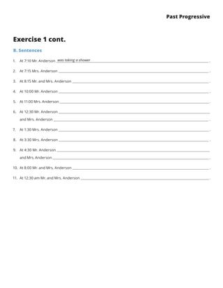 The document provides examples and exercises for using the past progressive tense in English. It includes schedules, sentences to complete, and verbs to fill in using either the past progressive or simple past form. The exercises focus on describing activities that were ongoing or happening at specific times in the past.