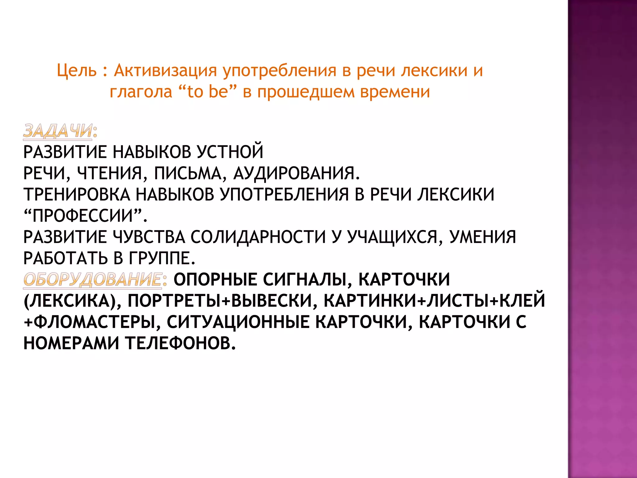 Документ рассматривает активизацию использования лексики и глагола 'to be' в прошедшем времени (past indefinite). Описываются правила образования этого времени для правильных и неправильных глаголов, а также способы образования вопросительных и отрицательных форм. Основной вывод заключается в важности понимания структуры и применения past simple для изучения иностранного языка.