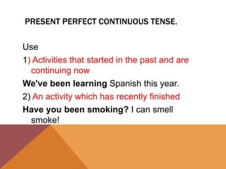 The document discusses the use of the past perfect tense in English. It provides examples of how the past perfect is used to indicate an action that was completed before another past action. It explains that the past perfect is formed using had + past participle. It also discusses how time expressions like "before" and "by the time" are often used with the past perfect to indicate one past action occurring prior to another.