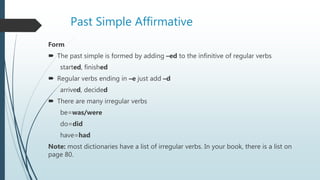 The document summarizes the past simple tense in English. It discusses the formation of regular and irregular past simple verbs. It notes that the past simple form does not change based on subject, except for the verb "to be". It then lists some common time expressions used with the past simple tense, such as "at", "on", "in", "yesterday", "last week/month/year", and "ago". Finally, it explains that the auxiliary verb "did" is used to form negative sentences, questions, and short answers in the past simple tense.