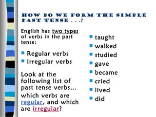The document discusses the simple past tense in English. It explains that there are regular verbs, which form the past tense by adding "-ed", and irregular verbs, which do not follow a set pattern. It provides examples of common regular and irregular verbs. It also covers the meaning and use of the simple past tense, including time expressions used with it. Finally, it discusses the pronunciation of the "-ed" ending on regular past tense verbs.