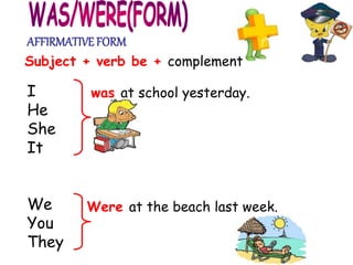 - Affirmative, negative, and question forms of the present and past tenses of the verb "to be" and regular verbs.