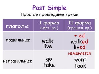 Документ посвящен правилам образования простого прошедшего времени (Past Simple) в английском языке. Он описывает правильные и неправильные глаголы, а также включает примеры применения окончаний -ed и их произношение в зависимости от условий. В документе также упоминаются некоторые исключения и особенности образования форм прошедшего времени.