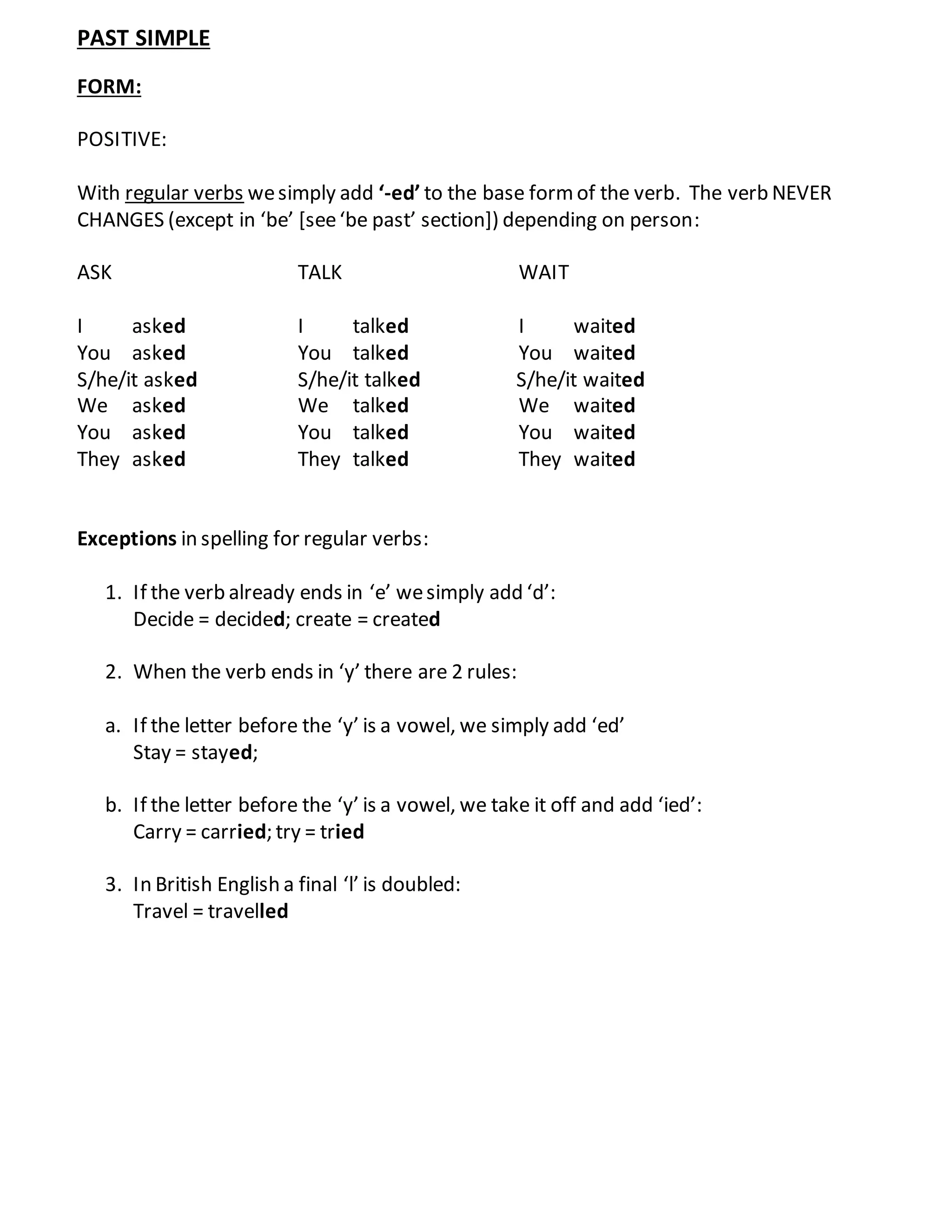 The document explains the formation and usage of the past simple tense in English, detailing positive, negative, and question structures for regular and irregular verbs. It describes specific spelling rules for regular verbs and provides various examples of irregular forms. The past simple tense is used to refer to completed actions in the past, often accompanied by time expressions.